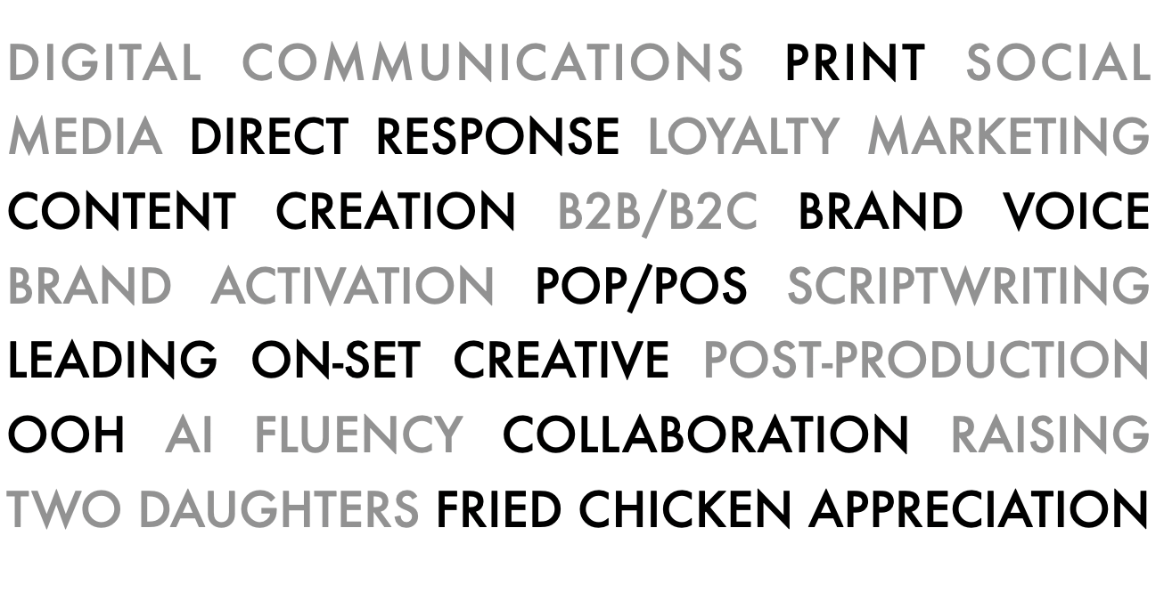 I’ve helped build brands on a local and global level across every industry from automotive, retail and health to finance, fuel and food service. In other words, I can capture the mindset of a 6-year-old at Christmas or a 65-year-old during Medicare open enrollment. Some might call it a superpower. I call it simply making a human connection.